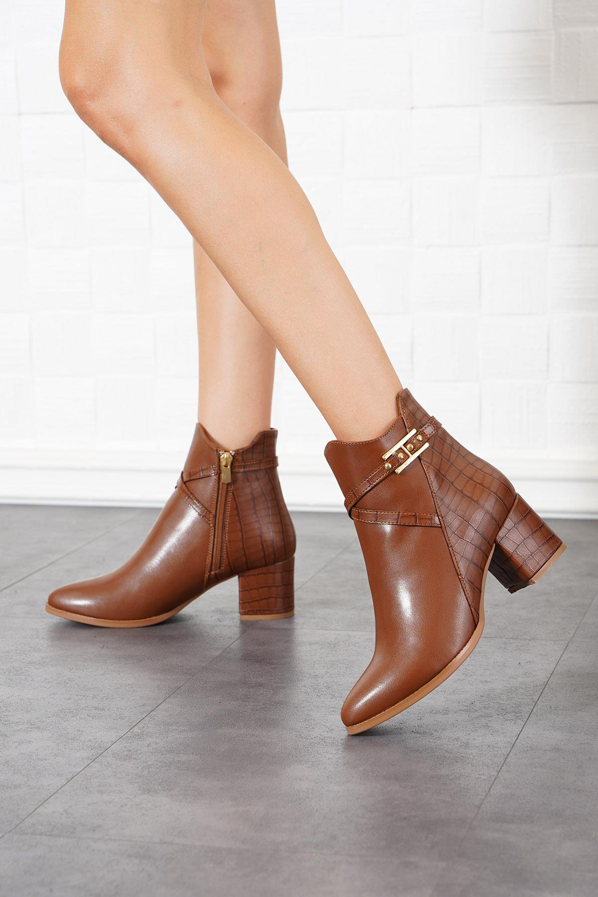 Ares Arka Kroka Kadın Topuklu Bot Taba Cilt