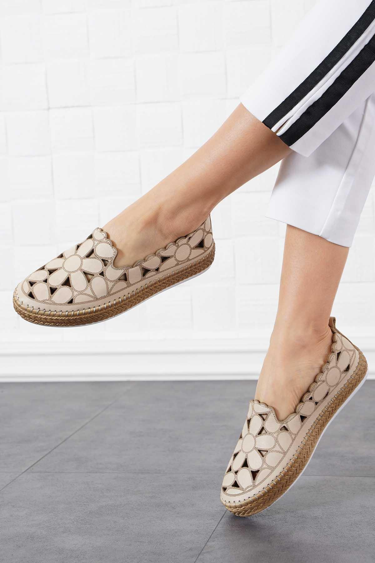 Remar Papatya Desenli Hakiki Deri Ayakkabı Bej Cilt (105 24Y08)